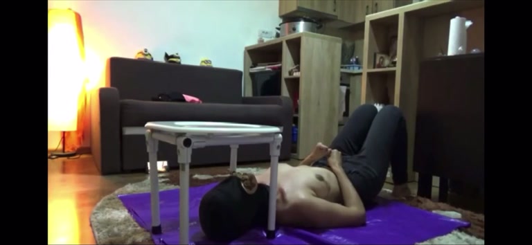 Dark haired babe feeds male slave with a big pile of shit. She's using a homemade toilet.