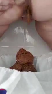 Chubby babe sits naked on her knees and she's pooping a lot in doggystyle.