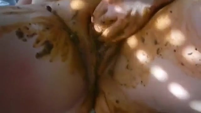 BBW babe smears a lot of shit on entire body. She begs her boyfriend to cum all over her pussy.