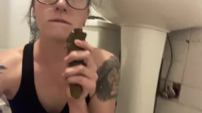 She's smearing poop on hairy pussy before she takes a big turd in mouth to swallow it.