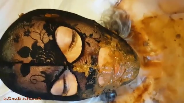 Masked teen smears poop on entire body. She gets face fucked, taking a cumshot deep down her throat.