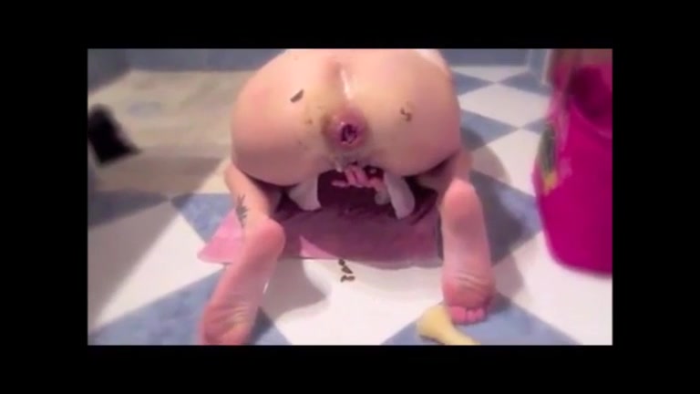 Shaved girl pooping in close up