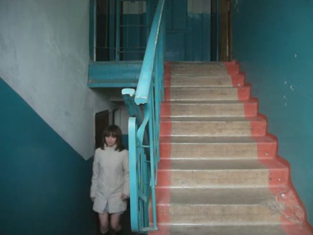 Cute girl takes a piss on the stairs while being filmed by a security camera