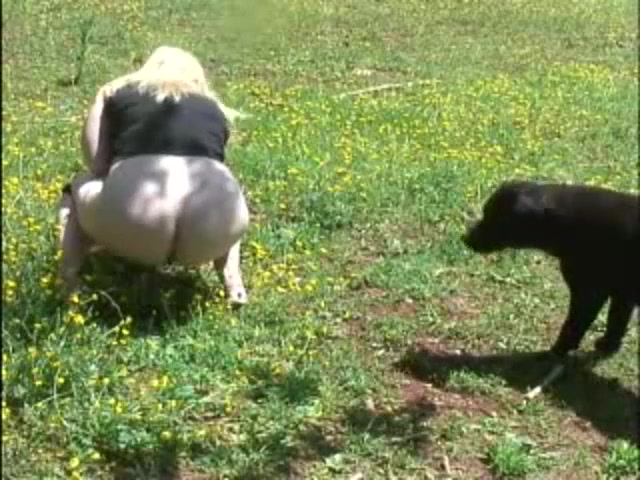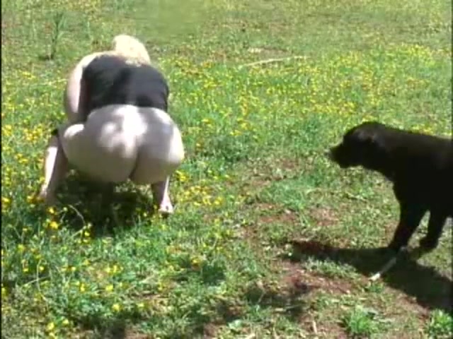 Fat woman shitting on the field while the dog is watching.
