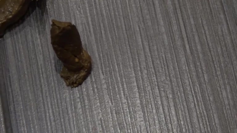 «We have here a super stimulating view of the well endowed thighs and bum of a sexy, naked brunette, seen from underneath as she, with much grunting, forces a bulky poo from her asshole on the bathroom floor, following which she wipes her bum, showing us the stained paper, and then she gives us extended views of her deposits on the ground; strangely, she sat on the loo after to pee; why did she not do all her business in the loo? now she, or someone, has to clean up her smelly mess.»