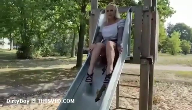 Mature blonde lady pooping on the slide