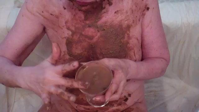 mature woman coverd in her own poop drinks her own piss and poop, with shit smeared all over her hot elderly sexy body