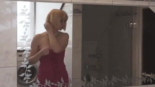 Blonde short haired lady playing with her messy load