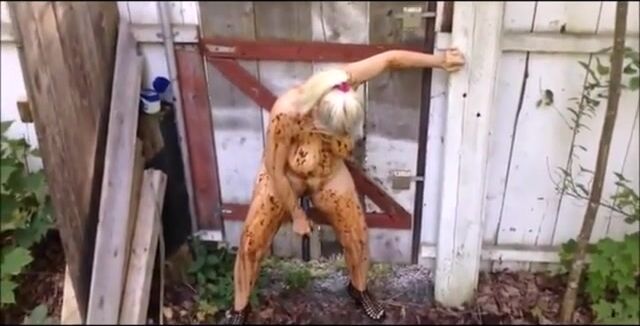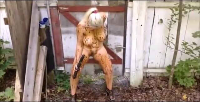 Blonde breasted MILF shitting in the shabby courtyard