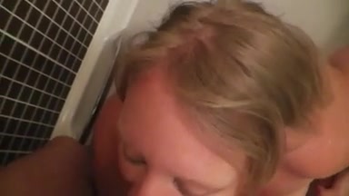 Woman in bathtub takes a mouthful of piss from her man and sucks his cock.