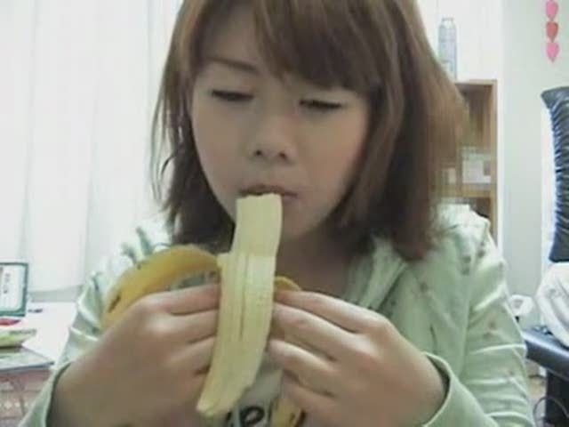 Asian girl eating banana and pooping afterwards.