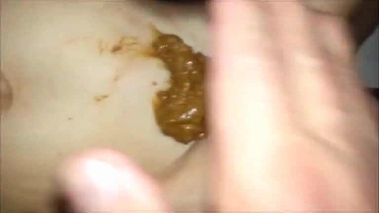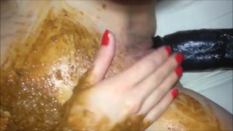 Woman bangs with dildo and smearing shit