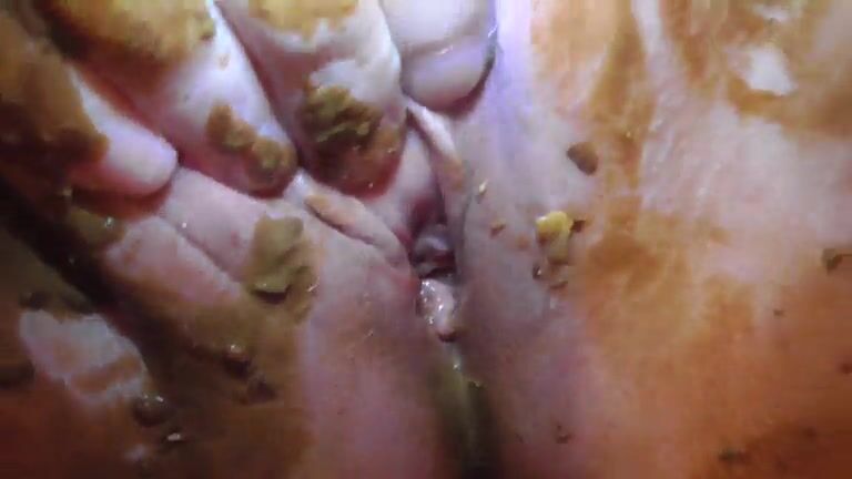Hot shaved pussy girl masturbates and smearing shit