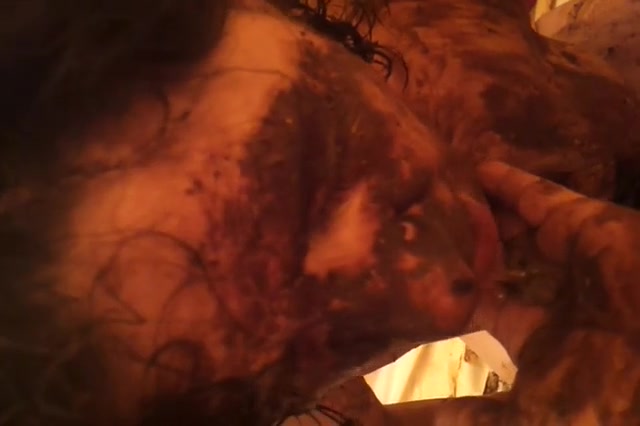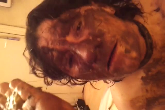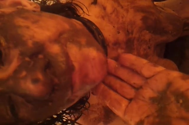 Girl whose body is covered with shit is puking.