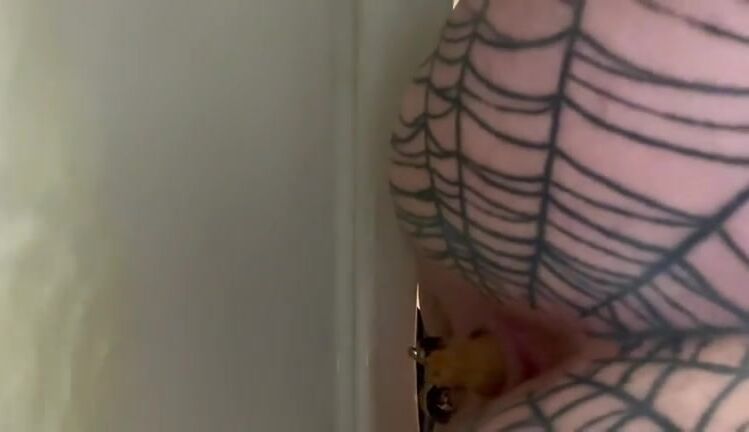 Tattooed blonde chick pooping in the toilet