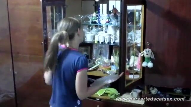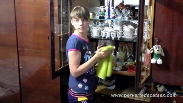 Cute brunette teen girl poops in the kitchen