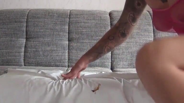German lady poops a fat sausage on the bed
