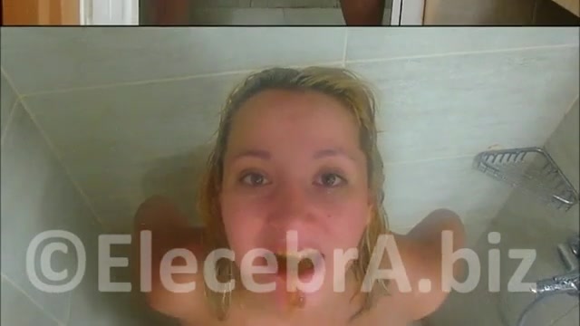 A blonde girl takes a shower and eats shit while spreading some all over body.
