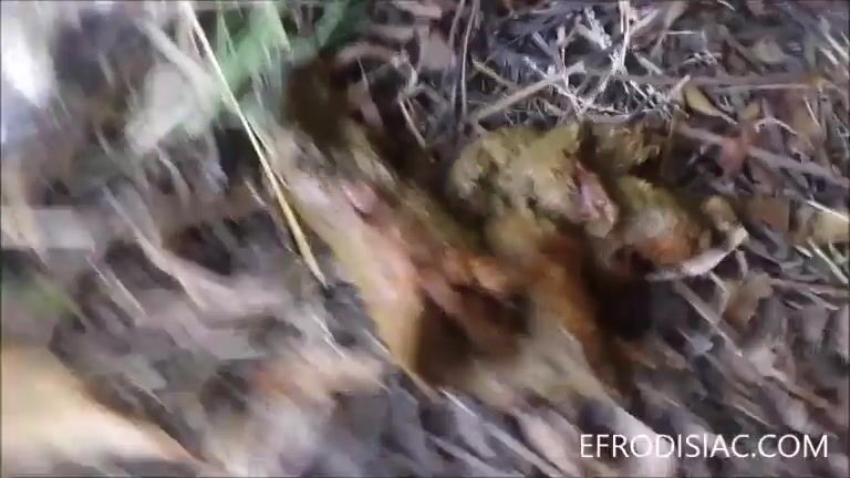 «Attractive dark haired girl, in a quiet part of garden or nature, drops her red pants, and, squatting, defecates a super bulky, sexy load, following which she does a hasty bum wipe, and then shows us her trophy on the grass.»