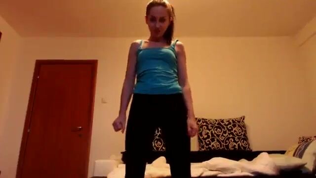 «This slender, dark haired lady in her twenties spends her whole fairly long video, constantly exercising, with much changes of posture; as the film proceeds, she removes all of her clothing, and carries on, totally naked, happy to display all of her assets, and also, she starts to drop turds from her asshole over quite some time, until the floor is littered with excrement, turds, small and bulky; she is also masturbating in the later stages, and, not surprisingly, she starts to ejaculate copious white discharge from her genitals, showing that she has been super roused sexually. She engages the camera much in her intimate gaze.»
