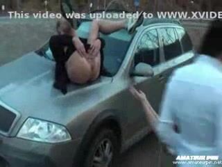 Woman pissing on car's hood