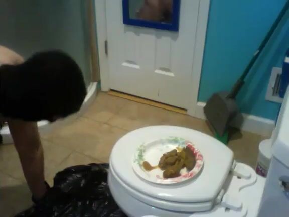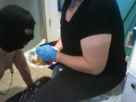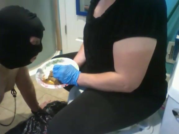 Mistress feeds messy shit to slave