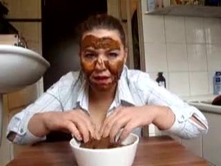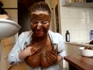 Slut smears shit all over her face and body