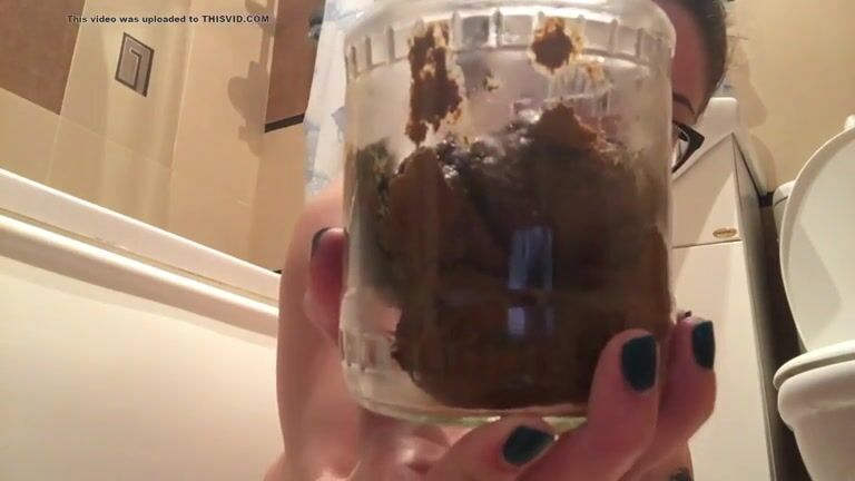Gorgeous girl in glasses teasing and pooping in the Jar