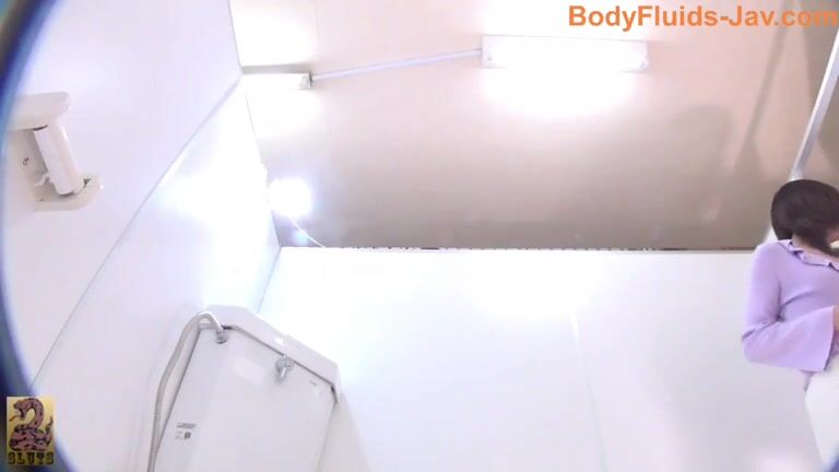 Brown haired girl pooping in public bathroom