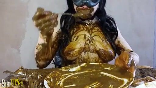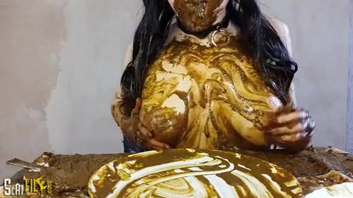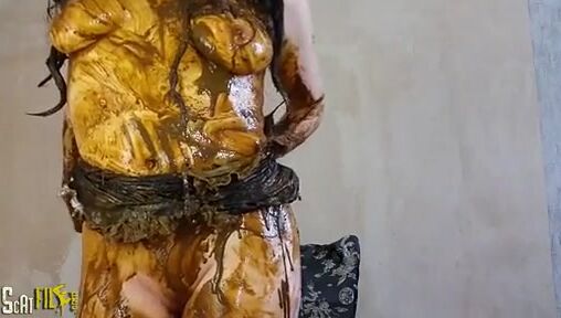 Brunette babe rubbing poop on her naked body