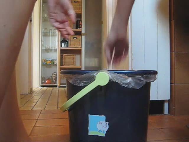 A sexy girl with a tattoo poops in the trash bin and hides quickly to avoid from being seen.