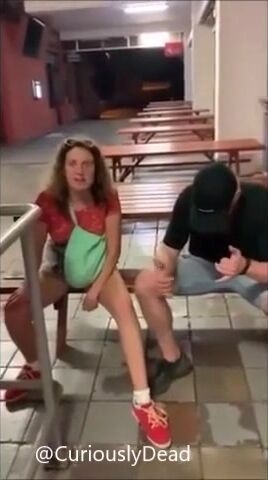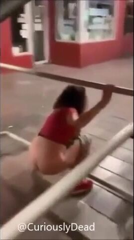Girl pisses on floor while holding railing in a public place