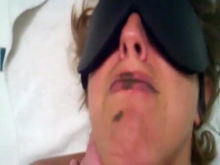 Woman in blindfold takes a massive brown turd in her mouth