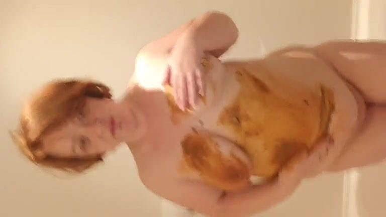 Chubby blonde slut smears shit all of her body