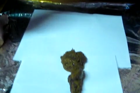 A fat woman poops a big turd with flying colors in standing position.