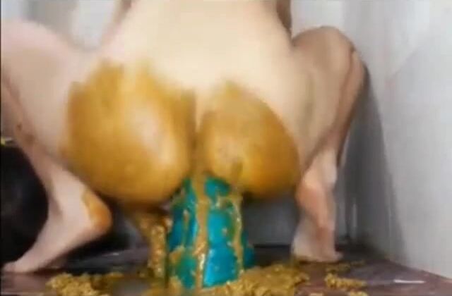 Dirty hot babe rides huge dildo while shitting