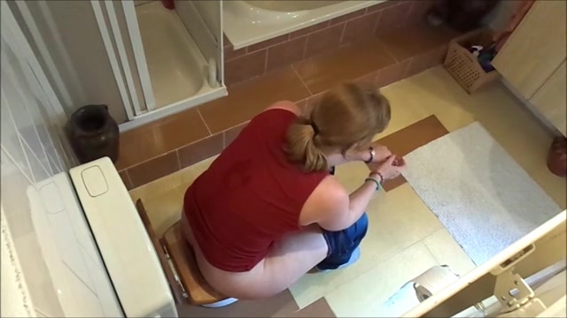 A blonde girl does her daily pooping ritual nicely and in flying colors.
