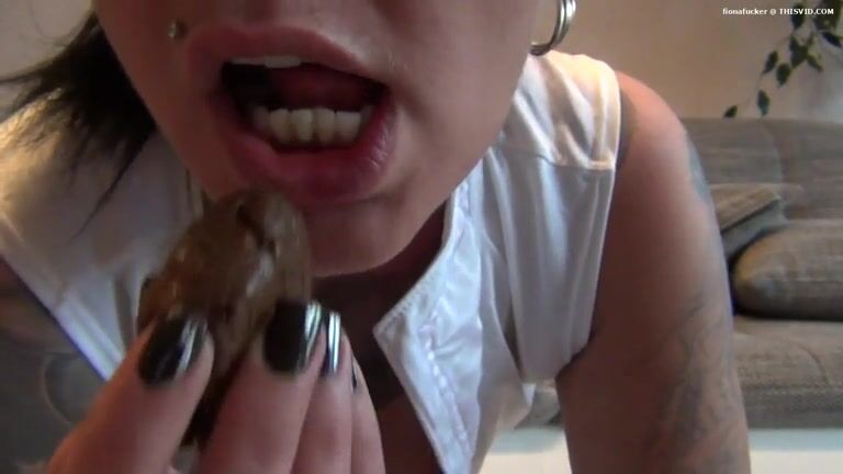 Naughty brunette lady eating yummy shit