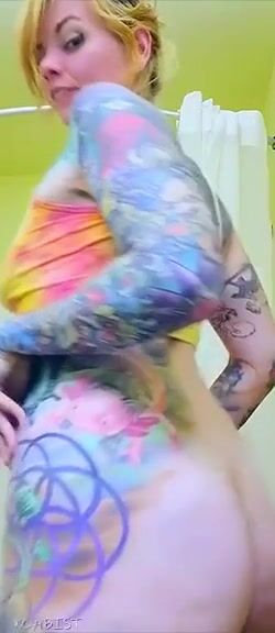Tattooed seductive babe dropping hot load