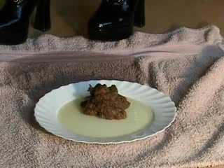 Beatrice, a brunette hot girl sits naked on the floor wearing only some leather boots. She starts shitting on a big white plate. She pees over that fresh shit after. Nice.