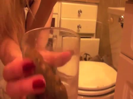 Sexy blonde girl went to the bathroom to take a shit but she wants to do it in an unique way so she takes that fresh shit in a glass and after she throws it the toilet. Why would you do that? It's kinda fucked up…