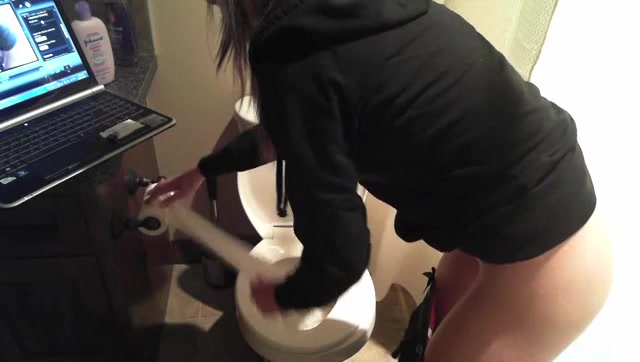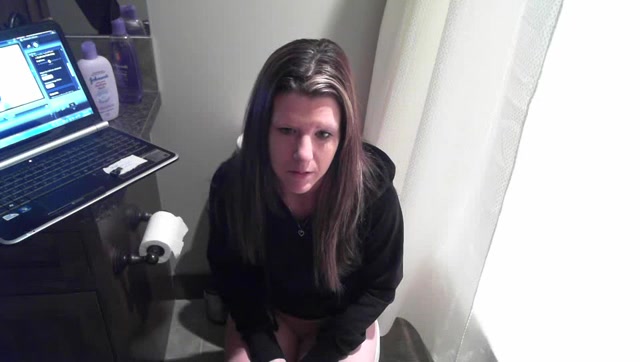 Middle aged brown haired woman is pooping in the toilet while she's watching a tv serial on her laptop. It's kinda sad that we can't see her pussy…