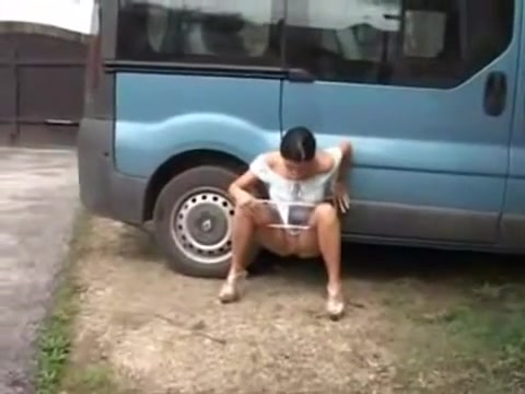 Hot brunette pulled over her car in the middle of the road. She took off her white panties and peed on the ground. We can see her sweet pussy in close up.
