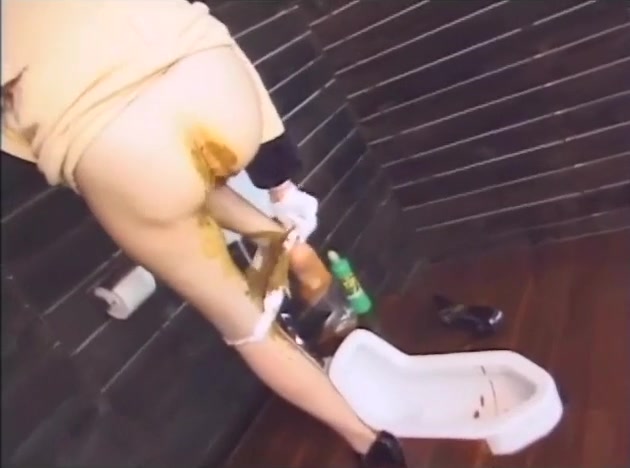 Hot brunette Japanese girl went to a public bathroom to take a shit. She carries fresh shit in a plastic bag. She's pooping a huge amount of diarheea all over the floor. She smears that brown liquid shit on her legs…