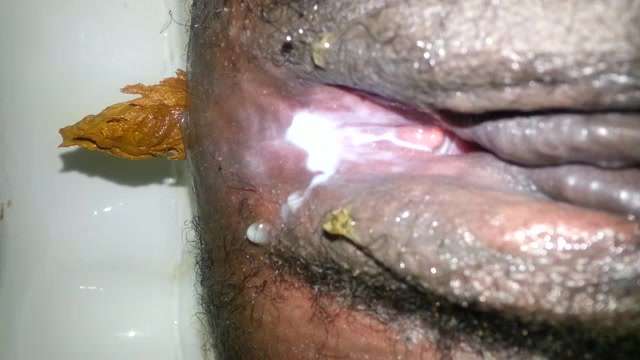 Ebony girl is pooping in the toilet…or at least she's trying. We notice that a white sticky thing leaks from her cunt. Prettty nasty…