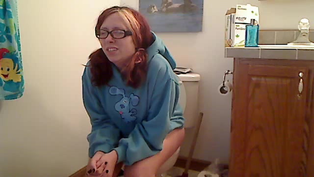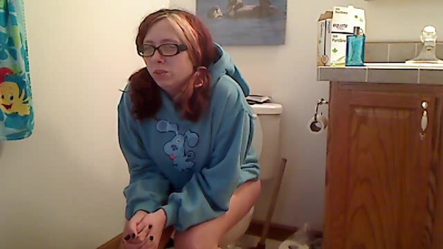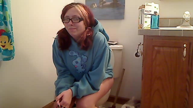 This nerd girl is trying to poop in the toilet but she's very constipated. She starts farting very loud and hard…before she managed to poop a big one…