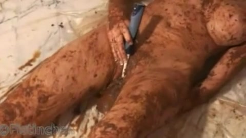 Brunette girl with very big tits sits naked on the floor in front of the camera. She smears fresh shit on her body. After that she starts masturbating with scat all over the place.