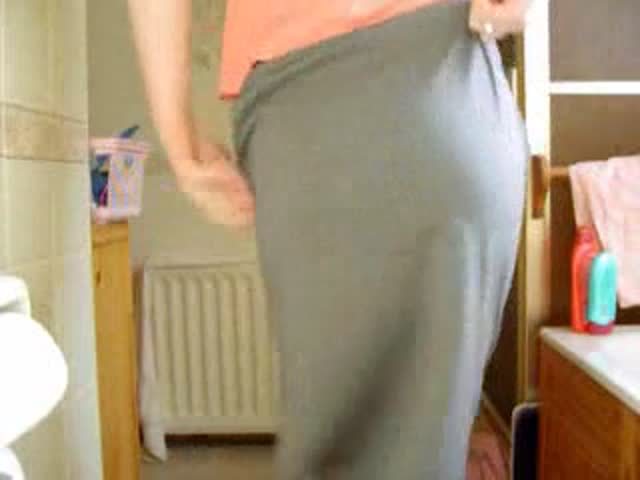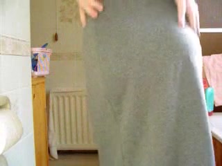 Hot MILF was really desperate to poop. Because of that she dropped a big one in her white panties and grey long skirt.