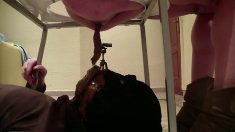 Sexy girl sits on a homemade toilet while she's pooping. Underneath the toilet…a mature man sits there with his mouth opened…